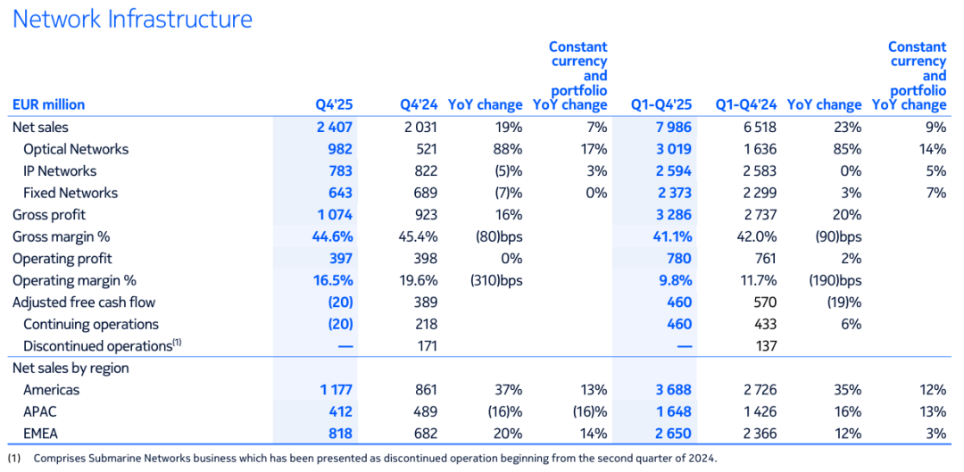 诺基亚的2025年Q4财报显示,61亿欧元的收入,同比增长2%。然而,真正值得注意的是光网络板块,它的收入增长了20%,成为了推动未来发展的关键。这不仅代表着诺基亚在技术上的全力押注,也意味着它正在通过创新来重新定义他们在全球通信供应链的格局。