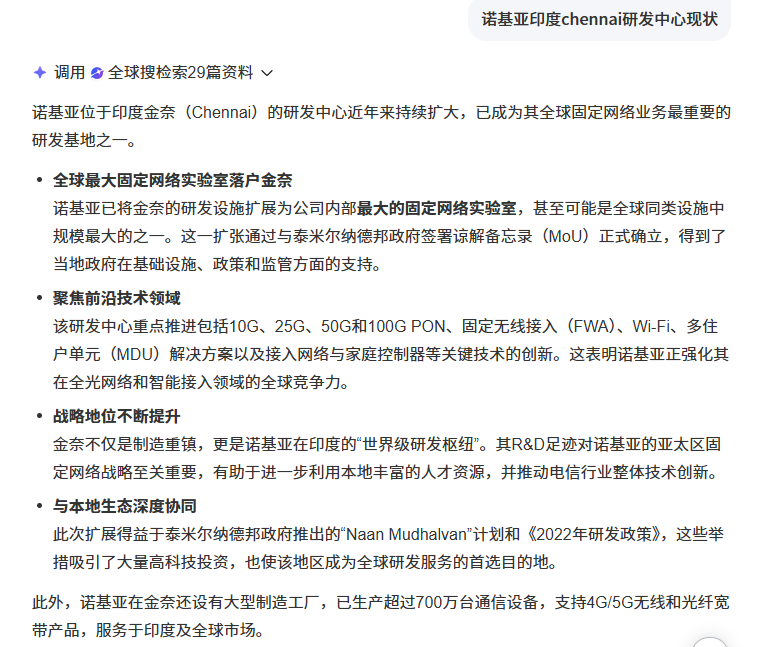 2026年2月10日,欧洲通信双雄之一的诺基亚传出在南亚大国印度布局其全球范围内最大的固网产品线(fixed network)研发中心,诺基亚NI部门将NI部门将选址选在了印度金奈(Chennai)的SIPCOT Siruseri园区,第一阶段的投资高达27亿印度卢比(约3,100万美元)。
