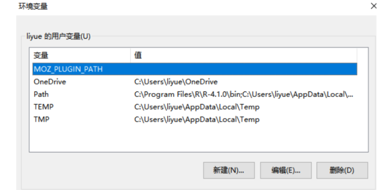 在用户变量那里,选中Path,然后编辑,添加一个R语言的路径进去,默认安装的话路径应该和我的差不多(你的路径和我的可能不一样,别照抄!),如果不是默认安装的话需要找到自己的R语言安装路径,保存即可,R语言路径参考上图。