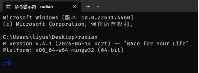 安装完成后直接在终端中输入radian会出现以下界面代表成功: