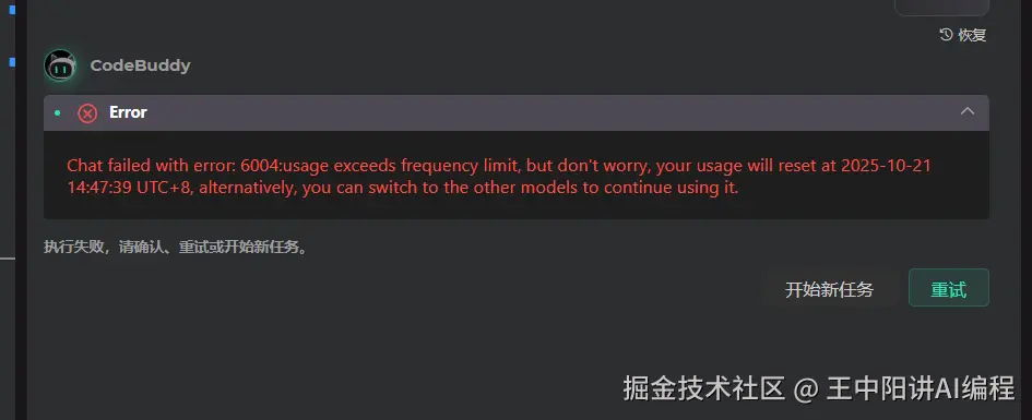 可以考虑切换个微信账号,或者换个其他的AI编辑器。 (收费的AI编辑器就不用担心这个问题了,只关心消费token花多少钱就行了,哈哈)