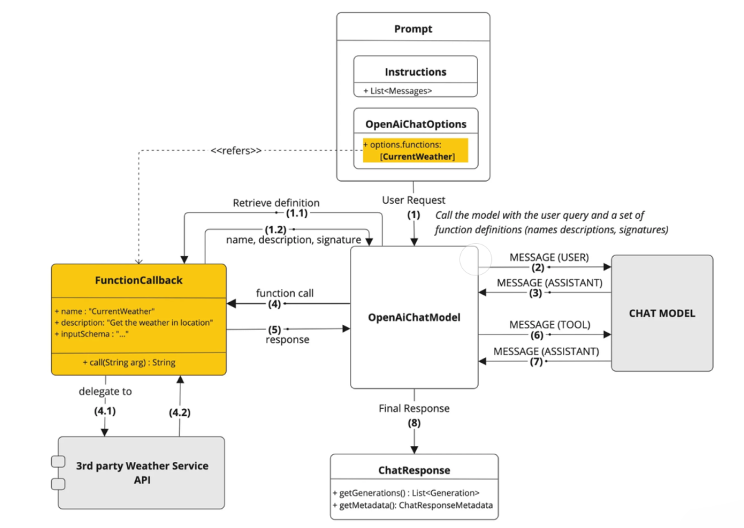 首先我们通过 Spring AI 官方 提供的图片来理解 Spring AI 在实现工具调用时都帮我们做了哪些事情?