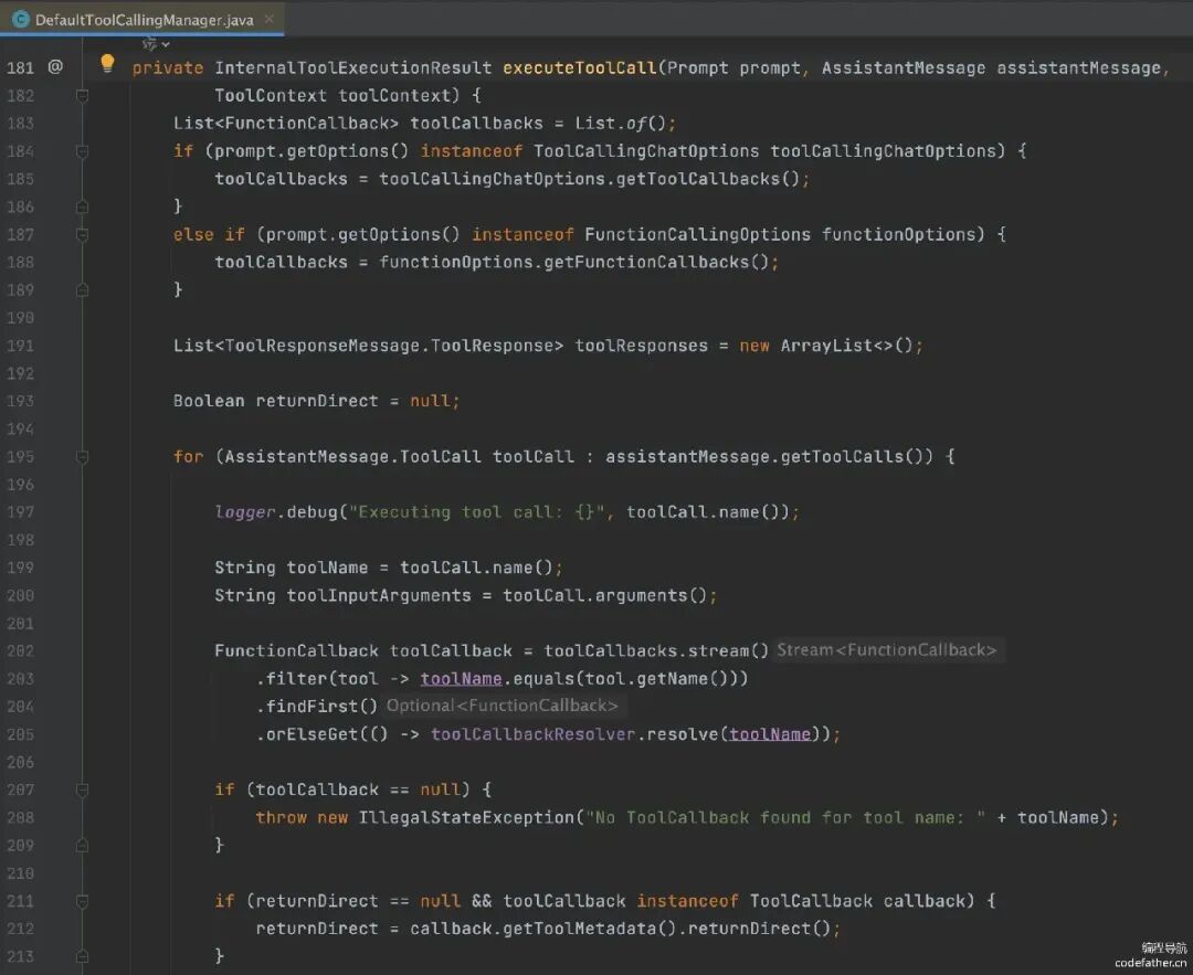 由于这块的实现可能会更新,建议大家学会看源码来分析,比如查看执行工具调用的源码,会发现它其实是从 AI 返回的 toolCalls 参数中获取要调用的工具: