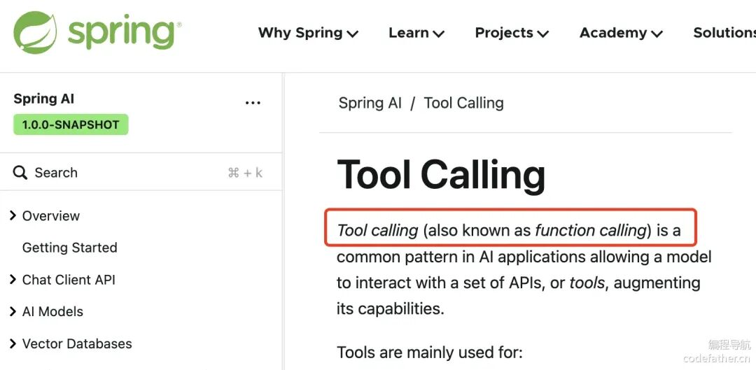 Spring AI 工具调用文档 的开头就说明了这一点: