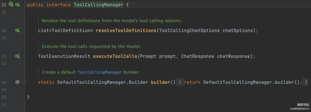 // 创建工具调用管理器ToolCallingManager toolCallingManager = DefaultToolCallingManager.builder().build();