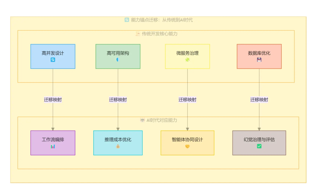 - 能力迁移:你擅长的 “高并发”、“高可用”架构思想,在AI时代等价于 “复杂工作流编排与推理成本优化” 。你的工程化优势,将在AI落地阶段全面爆发。