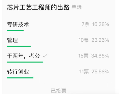 关于昨天大家对芯片工程师未来职业的投票,专研技术是最少的选择,考公才是大家的最爱啊。