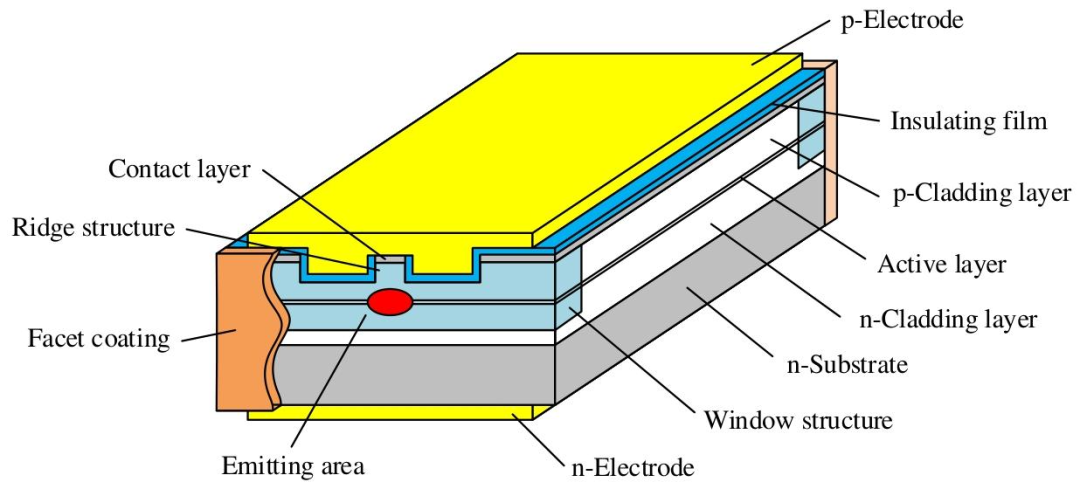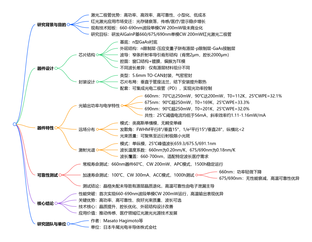 日本牛尾光电半导体团队研发出基于 AlGaInP 材料、适用于传感和医疗领域的 660nm、675nm、690nm 波段单模连续波 200mW 红光激光二极管,波段单模运行。器件采用窄条折射率导引脊形结构芯片,腔长 2000μm、脊宽 2μm,封装为 5.6mm 气密 TO-CAN 结构并集成光电二极管,仅有源层组分随波长调整。