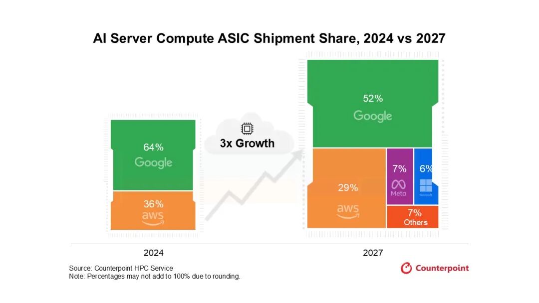 Counterpoint Research研究员David Wu 强调:“尽管由于市场规模不断扩大,以及竞争对手(如通过博通、Marvell和Alchip等设计服务公司帮助定制ASIC)纷纷采用自研芯片,预计谷歌的市场份额将在2027年下降至52%,但其TPU集群仍将是无可争议的行业核心和标杆。这一基准的支撑源于训练和运行下一代Gemini模型所需的庞大且持续的计算能力,而这又需要谷歌持续、积极地扩充其内部芯片基础设施。”