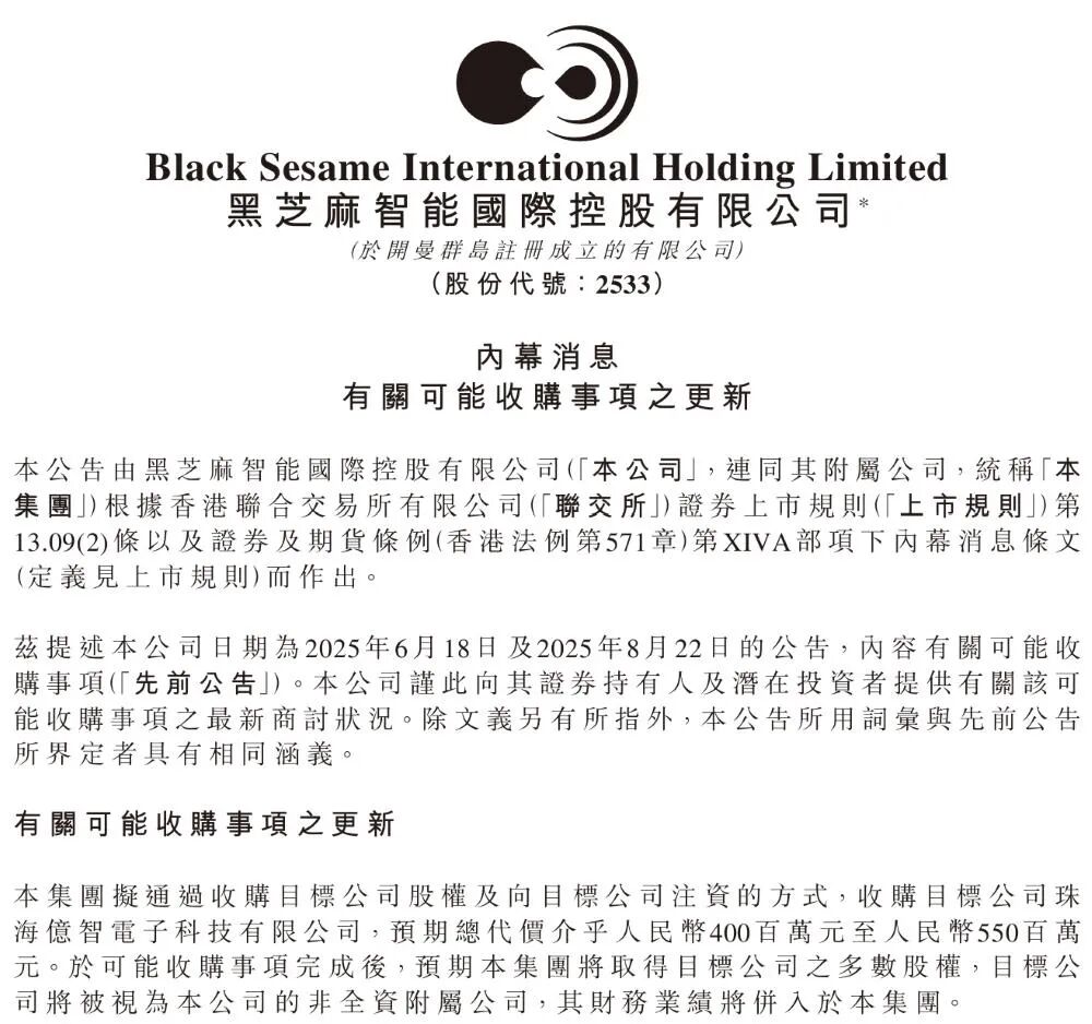其实,早在今年6月及8月,黑芝麻智能曾就“可能收购事项”发布相关公告,但未直接公布标的公司名称。