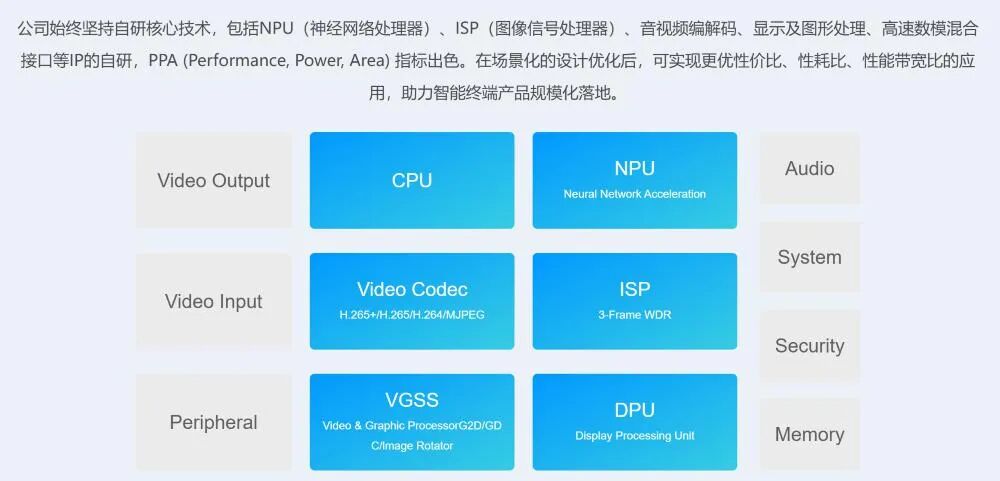 亿智电子的核心竞争力在于AI加速(NPU)、图像信号处理器(ISP)、高清显示、音视频编解码、高速数模混合等核IP均自主研发,构建了从底层IP到上层算法的完整技术闭环。2019年量产搭载自研NPU的边缘侧/端侧AI SoC芯片(业内首款软硬协同的图文识别SoC芯片),已助力众多合作伙伴实现AI产品的规模量产。目前,亿智电子打造了多场景的AI芯片产品矩阵,包括SA/SH/SV三大系列边缘侧/端侧AI SoC芯片,覆盖边缘侧/端侧AI的多种应用场景。