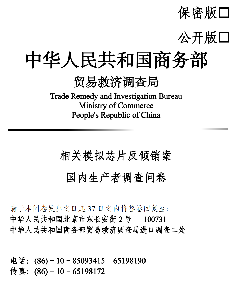10月22日,中国商务部贸易救济调查局发布了“关于发放相关模拟芯片反倾销案调查问卷的通知”。调查主要针对原产于美国的通用接口芯片和栅极驱动芯片,相关利害关系方应按要求在问卷发放之日起37日之内如实填写,并提交完整准确的答卷。
