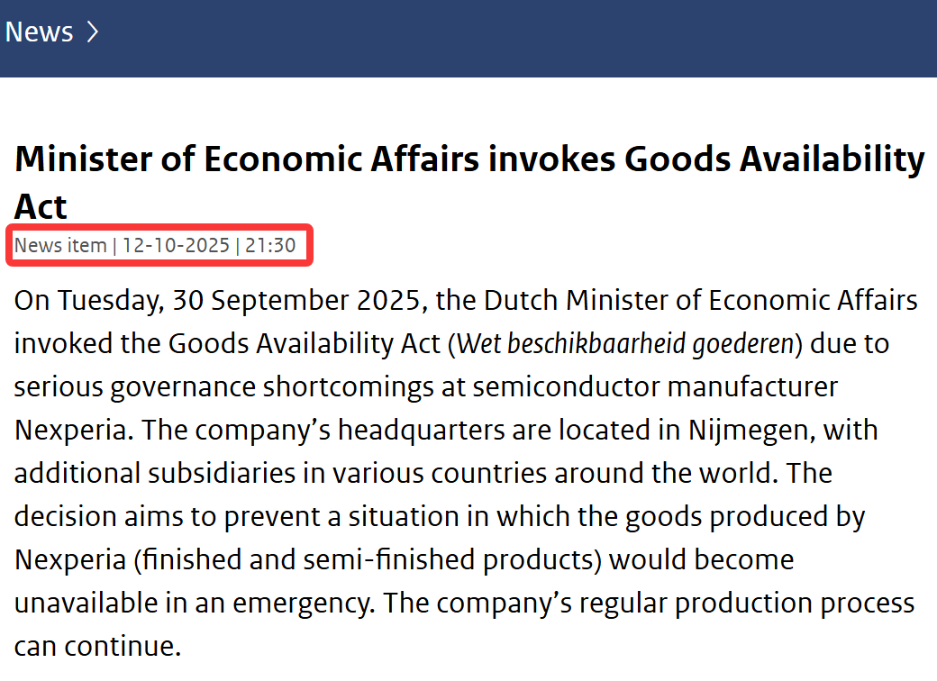 2025年9月30日,星期二,由于半导体制造商安世半导体(Nexperia)存在严重的治理缺陷,荷兰经济事务部长援引了《商品可用性法案》(Wet beschikbaarheid goederen)。该决定旨在防止安世半导体生产的商品(成品和半成品)在紧急情况下无法获得的情况。公司的常规生产流程可以继续进行。