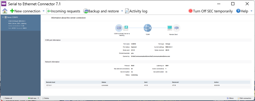 创建客户端连接将启动使用TCP / IP协议将本地实际或虚拟串行端口数据重定向到远程串行设备服务器。