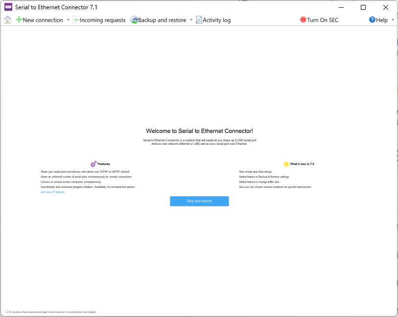 Serial to Ethernet Connector是一款非常实用且功能完善的Windows串行转以太网连接器(SEC),允许通过Internet或LAN共享任意数量的真实或虚拟串行端口,该软件使多个远程计算机(客户端)可以连接到本地计算机9(服务器)上共享的设备,并与它们通信,就好像这些设备直接连接到客户端计算机一样;使用此工具,用户可以共享无限数量的串行端口,用于通过TCP/IP网络进行远程连接,可以选择将用于连接的数据传输协议:原始数据传输算法或Telnet(RFC 2217)协议;支持动态更改连接参数,而无需重新打开或重新创建连接,自定义高级连接设置,支持设置暂停,然后使用UDP或TCP作为底层协议时,所有接收到的数据都将发送到远端;需要的用户可以下载体验