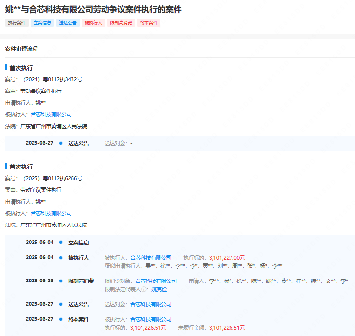 根据此前广州市黄埔区人民法院发布的公告显示,由于申请人姚骏俊与合芯科技的劳动争议案件执行,将被执行人合芯科技移送广东省广州市中级人民法院进行破产审查。涉及的执行标的和未执行金额均约为310万元。