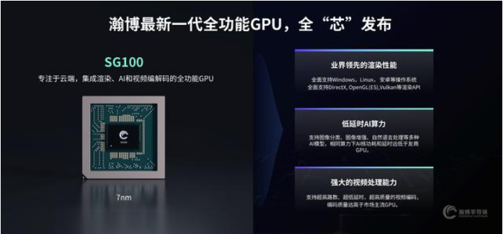 △瀚博半导体第二代全功能GPU芯片 SG100据介绍,瀚博SG100芯片采用7nm先进制程,具备业界领先的渲染性能,同时兼具低延时高吞吐的AI算力和强大的视频处理能力。搭载瀚博自研GPU软件栈,业界一流的SR-IOV硬件虚拟化技术,支持Windows/Linux下的DirectX 11、OpenGL、Vulkan等API接口,支持H.264、H.265、AV1等多种视频编解码格式,可广泛支持数字孪生、数字人、云桌面、云手机、云游戏、云渲染、工业软件等多领域应用,助力打造元宇宙产业算力底座。