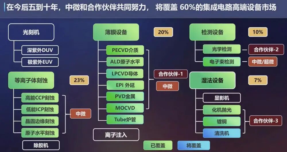 据尹志尧预计,今后五到十年内,中微公司将与合作伙伴共同覆盖60%的集成电路高端设备,包括刻蚀、薄膜及量检测的全部设备,以及一部分湿法设备,成为一家大型的平台式的半导体设备公司。