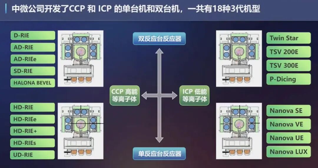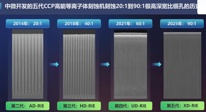 从产品精度来看,中微的ICP刻蚀机的加工精度已经达到100皮米以下水平,双台刻蚀机实现原子、亚原子水平刻蚀控制,也达到全球领先水平。在面向存储领域所要求的高深宽比的深孔刻蚀方面,中微公司已经实现90:1的深孔刻蚀,并正在突破100:1的深孔刻蚀,而目前业界主流量产所采用的刻蚀机的深宽比还在60:1。