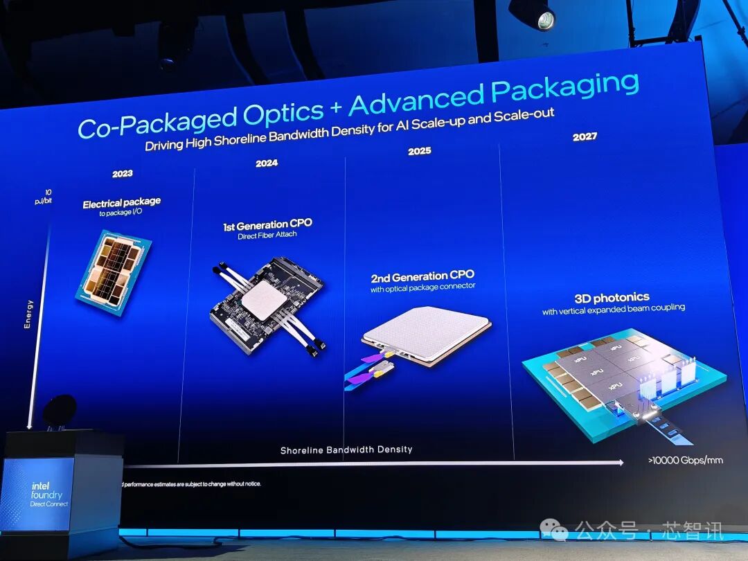 英特尔还展示了其最新的共封装光学+先进封装方案,今年即将实现第二代的技术交付,2027年则将推出3D集成的光学共封装方案。