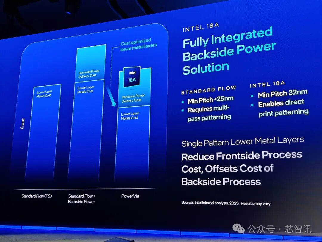 据介绍,Intel 18A作为完全集成背面供电技术的制程节点,虽然此举使得其晶体管最小间距为32nm(大于典型的25nm),但是可以直接一次打印图案,而原有的典型方案则需要多道图案化,因此Intel 18A可以进一步降低工序成本。
