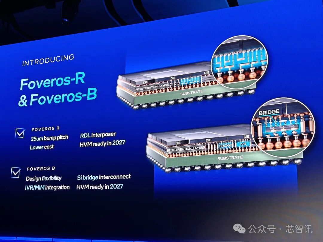 其中,Foveros-R的bump间距为25微米,主要面向RDL夹层设计,可以低成本的实现。Foveros-B则支持更加灵活的设计,主要面向硅桥接互联。这两项技术都将于2027年实现大规模量产。