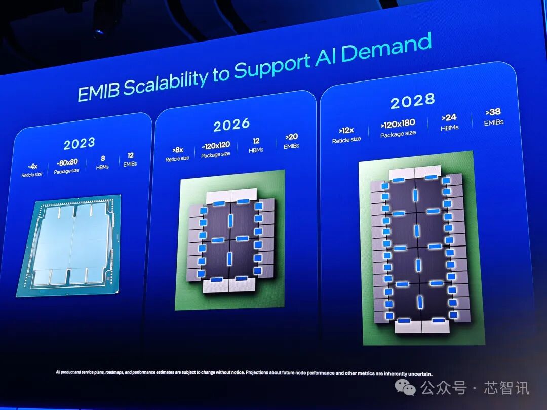 英特尔表示,EMIB的可扩展性可以支持广泛的AI芯片设计需求,2026年将可支持120mm*120mm的封装尺寸,可以集成4个计算Die和12个HBM,可能需要用到20个EMIB互联;2028年将支持120mm*180mm的封装尺寸,可以集成多达8个计算die和24个HBM,可能需要用到38个EMIB互联。