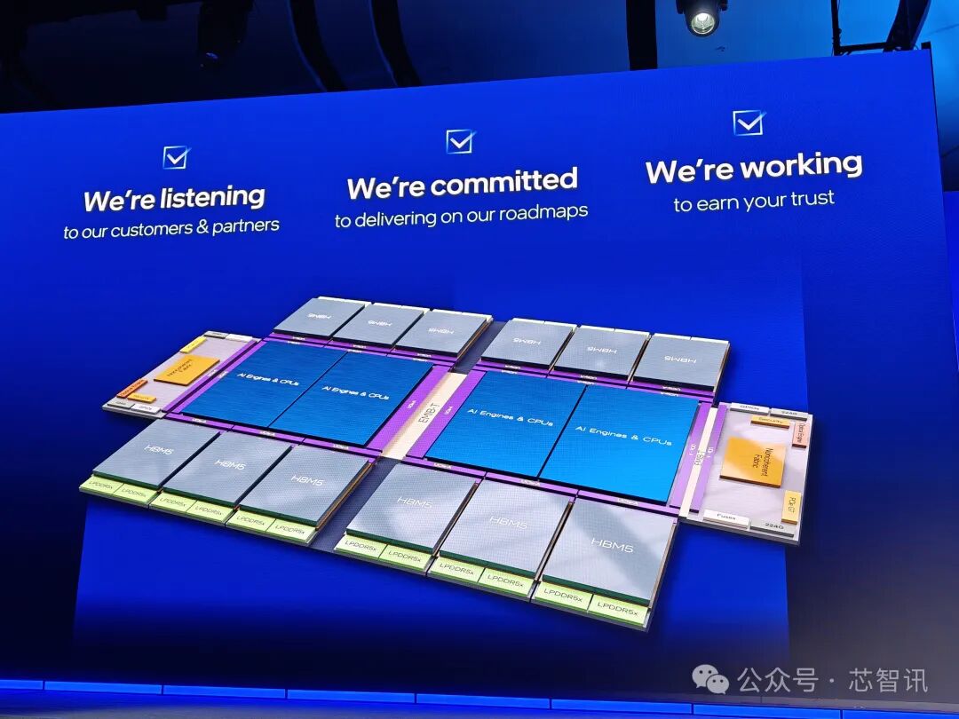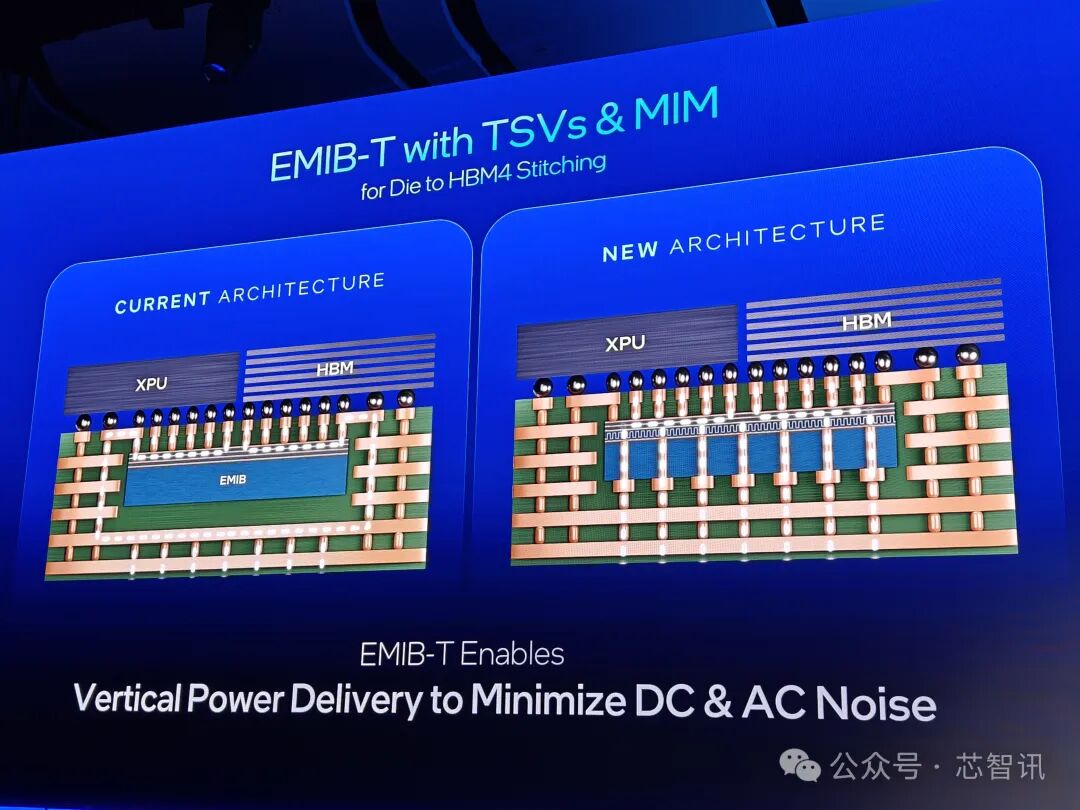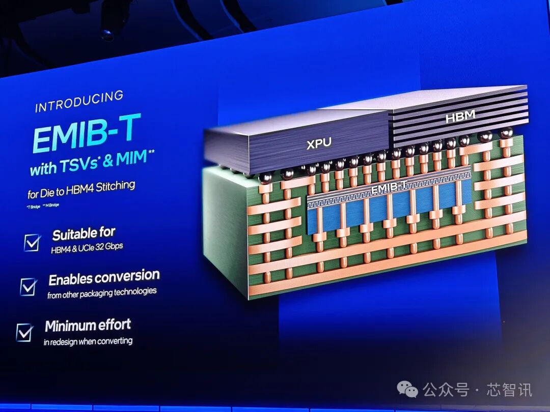 英特尔还在现场展示了基于其EMIB-T技术的全新的超大规模Chiplet集成方案,可以将基于尖端制程的4个计算die与多达12个HBM5规格的高带宽内存通过EMIB-T技术和UCIe进行互联的解决方案。
