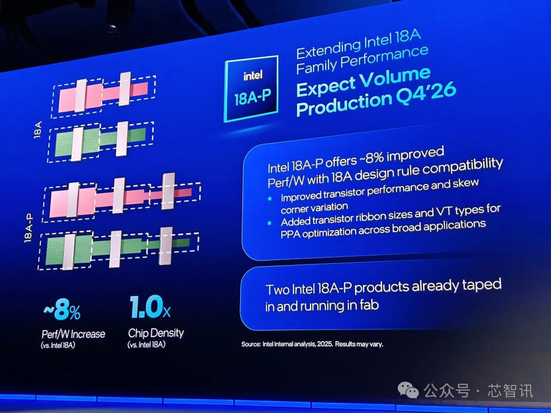 据介绍,Intel 18A-P在密度不变的情况下,每瓦特性能将会比18A提升8%,将为更大范围的代工客户带来更卓越的性能。Intel 18A-P的早期试验晶圆(early wafers)目前已经开始生产,预计将会在2026年第四季度量产。