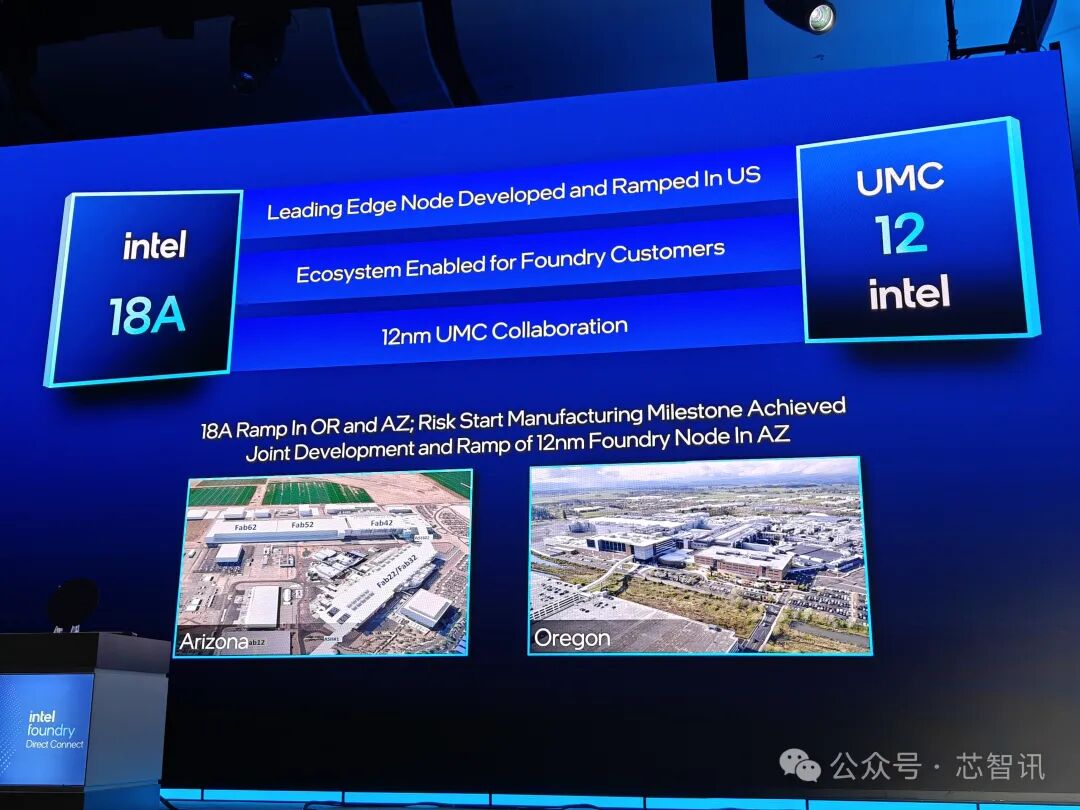 在此次2025英特尔代工大会,英特尔宣布其最新的Intel 18A正率先在其俄勒冈州晶圆厂试产,预计该晶圆厂也将率先在年底实现大规模量产Intel 18A。同时其亚利桑那州的Fab 52 晶圆厂也已成功完成 Intel 18A的流片(run the lot),标志着该厂首批晶圆(wafer)顺利试产成功,预计将于今年晚些时候该晶圆厂的Intel 18A将进入量产爬坡阶段(ramp up)。此外,英特尔和联电合作的12nm也将会在俄勒冈州和亚利桑那州晶圆厂进行量产。