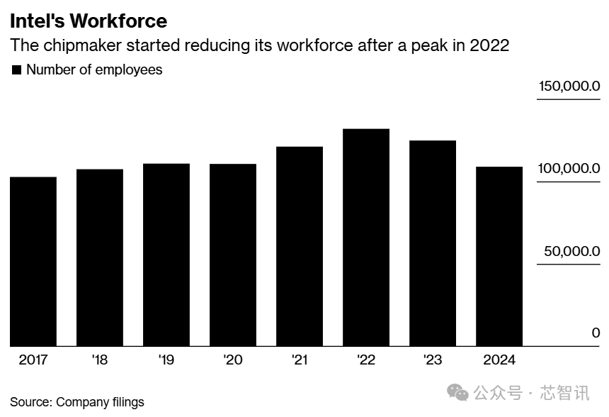 去年8月,英特尔就曾因“财务危机”爆发而被迫宣布削减100亿美元成本计划,其中包括全球裁员15%,即削减约15,000个工作岗位,目标是在2024年底之前完成。根据财报数据显示,截至2024年底,英特尔旗下仍拥有108,900名员工。
