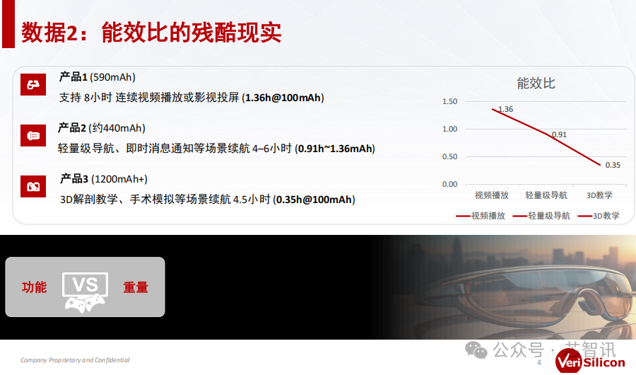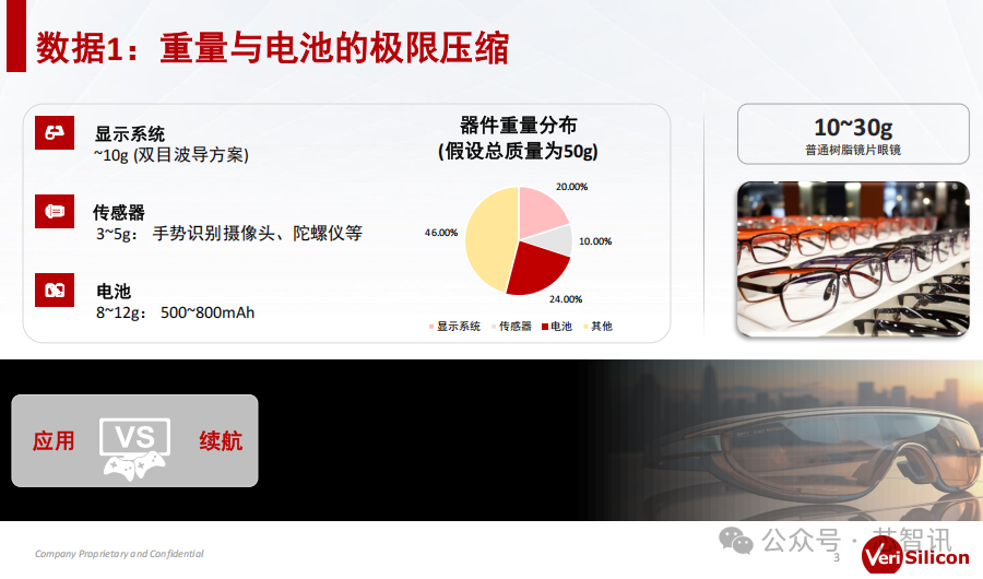 根据芯原调研的三款AR眼镜来看:产品1配备了500mAh电池,支持8小时连续视频播放或影视投屏;产品2电池容量约440mAh,在轻量级导航、即时消息通知等场景续航4-6小时;产品3配备了1200mAh+电池,支持3D解剖教学、手术模拟等场景续航4.5小时。显然,随着应用的复杂性越来越高,其对于性能的要求也越来越高,即便其配备了更大的电池,整个续航时间也会大幅下降。