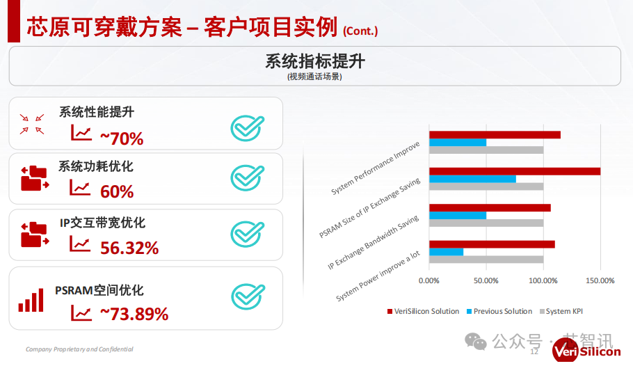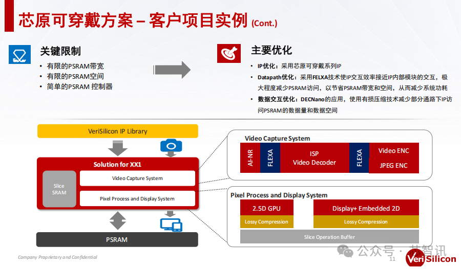 具体来说,客户在采用了芯原可穿戴系列的IP之后,整体上相对于原始方案面积节省了20%,在IP级的功耗上降低了30%;客户深入地基于芯原的可穿戴方案的技术点分析了整个产品芯片的应用场景,去对芯原的整个子系统进行了一个重新的重分配,在Datapath上做了更多的优化,在整个Datapath上用了FLEXA数据压缩,使得子系统几乎做到了全DDRS的方案,对外存的访问降低到了极低的一个比例。