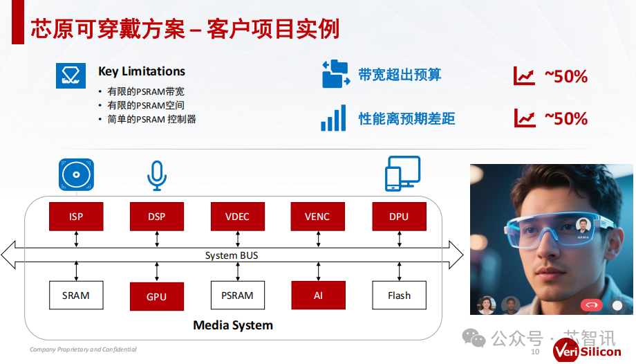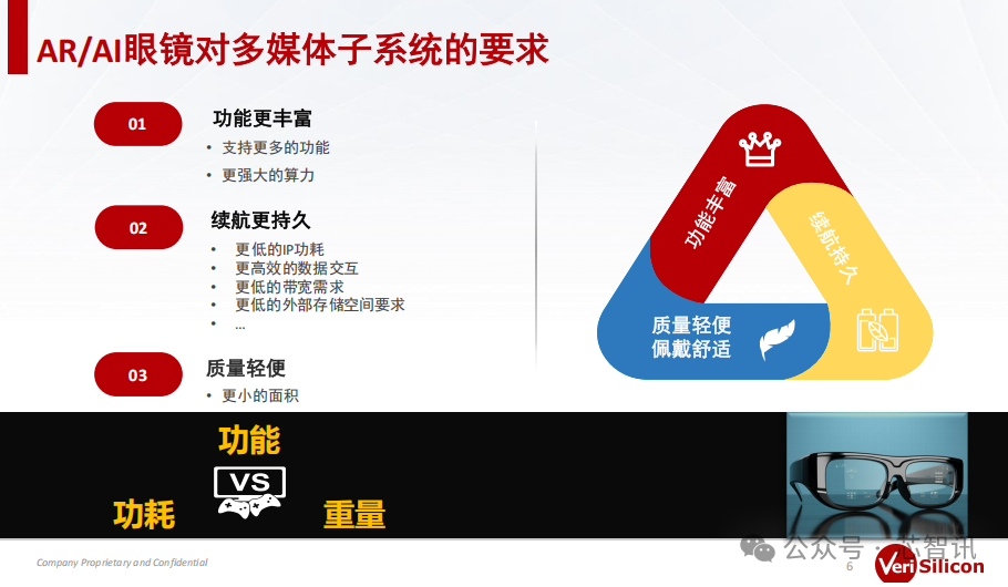 从AI/AR眼镜的体验来说,随着应用的持续拓展,对于性能的要求会越来越高,对于续航也会有着较高的要求,同时整机重量也需要能够让用户长时间佩戴感觉舒适。因此,对于AI/AR眼镜的多媒体子系统的整个开发来说,就需要支持更丰富的功能、支持更强大的算力,同时还需要做到更小的面积、更低的功耗、更高效的数据交付和更低的带宽延迟需求。即需要尽可能平衡从功能丰富性、续航能力、以及质量轻便(佩戴舒适度)上去做一个很好的平衡。因此,提升整个AI/AR眼镜的系统的能效比,成为提升用户体验的一个关键抓手。