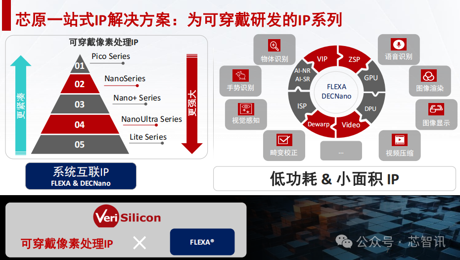 芯原作为中国最大的半导体IP厂商,近年来针对可穿戴市场研发了自己专用的一些IP系列,包括GPU、NPU、ISP、Dewarp、Video等IP系列,可以实现物体识别、手势识别、视觉感知、语音识别、图象渲染、图象显示等功能,并且能够做到尽可能的低功耗和小面积,可以覆盖从AI/AR眼镜到手表等不同的可穿戴设备的应用落地。