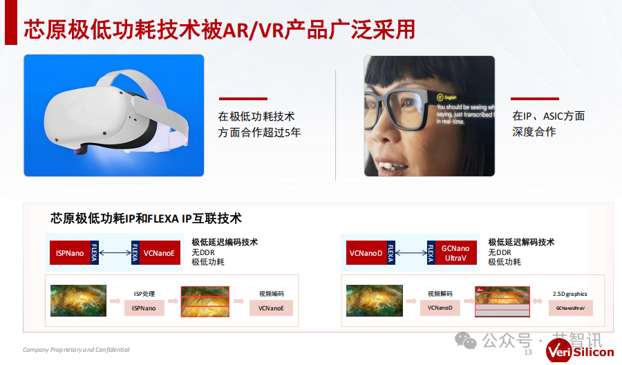 据刘律宏介绍,芯原的极低功耗方案在AR/VR产品上已经被广泛的采用。比如,客户的视频采集子系统和后面的显示子系统,都用到了芯原的FLEXA技术、实现了极低延迟编码和极低延迟解码,极低延迟的功能实现。