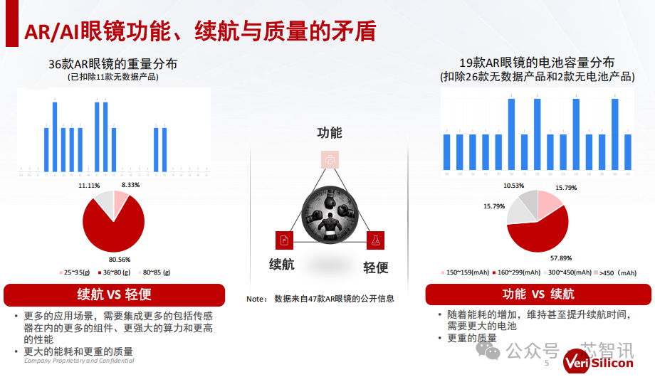 因此,对于AR/AI眼镜厂商来说,必然需要在功能、续航和重量上做出一个平衡的选择。根据芯原从市面上找了47款AR眼镜的调研来看,扣除了一些无效数据后,发现大部分消费类的AR眼镜的重量分布是在30g-80g左右,它的电池容量绝大部分集中在450mAh以下。