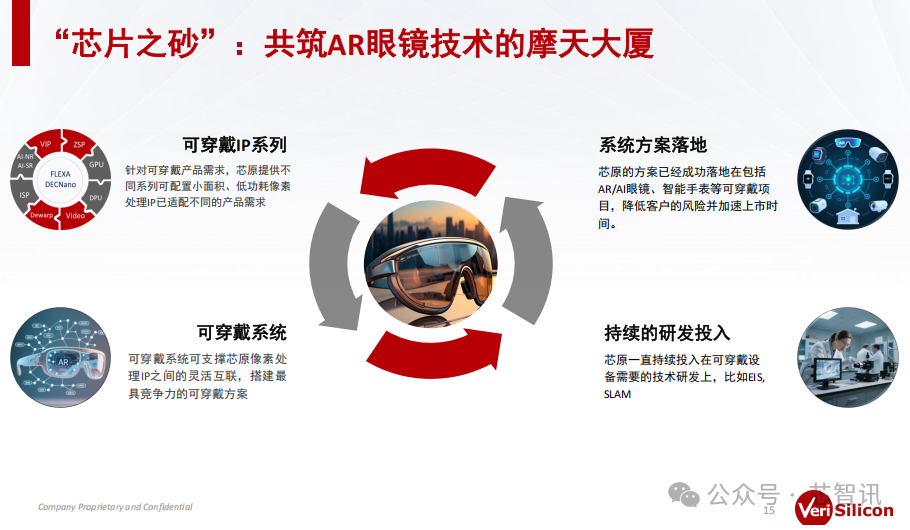 在芯原看来,AR眼镜技术绝对不是一家可以独自去实现的,它可以看做是一个大的生态的建设,所以芯原会持续地在AR眼镜这一套可穿戴方案上持续的开发,会在可穿戴IP系列、可穿戴系统、系统方案落地、可穿戴所需的新技术(比如EIS、SLAM)的研发上进行持续性的投入。