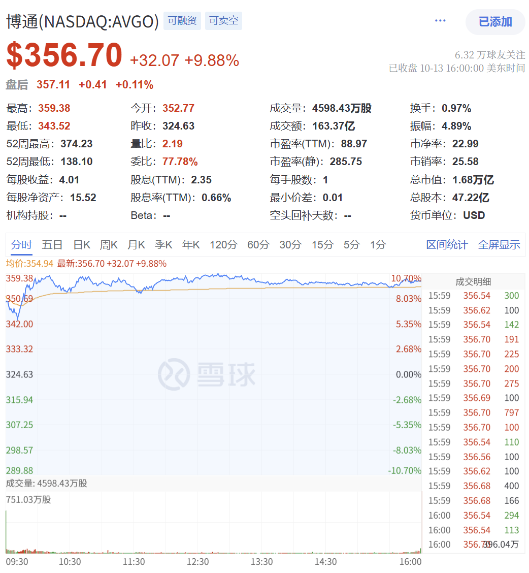 受该消息影响,博通的股价在盘前交易中飙涨超过10%,截至10月13日美股收盘,博通股价仍保持了9.88%的涨幅,市值达到了1.68万亿美元。