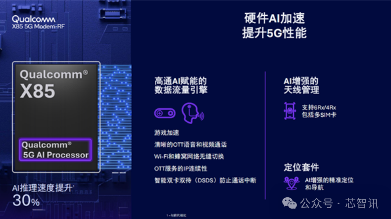 高通X85还集成了第四代专用AI处理器,性能更加强大,AI推理速度比上代提升30%,可以运行更多的AI专用5G算法,从而有效提升连接体验。