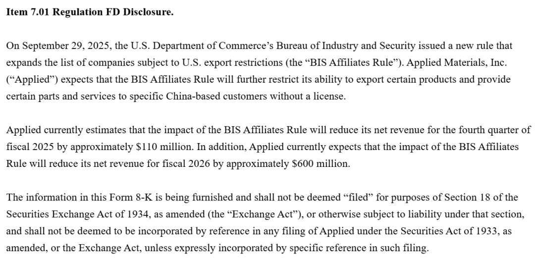作为全球半导体设备大厂,应用材料在最新的公告中指出,其预计BIS关联公司规则将进一步限制其在没有许可证的情况下出口某些产品并向特定的中国客户提供某些零件和服务的能力。预计将导致其2025财年第四财季营收减少1.1亿美元,2026财年营收将减少6亿美元。