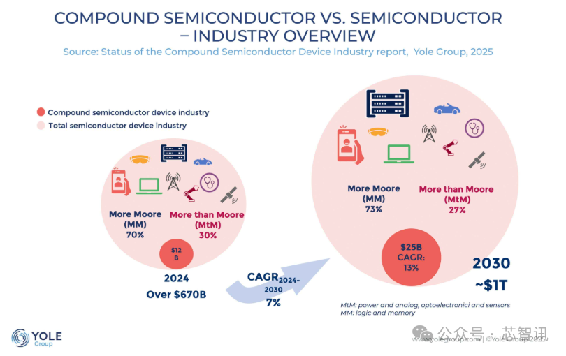 Yole Group 化合物半导体活动经理Ezgi Dogmus 博士表示,化合物半导体器件行业在 2024 年至 2030 年期间处于快速增长轨道上,复合年增长率 接近 13%,令人印象深刻,超过了更广泛的半导体市场。蓬勃发展的汽车和移动出行行业推动了这种加速,电信、基础设施和消费电子产品也带来了强劲的势头。