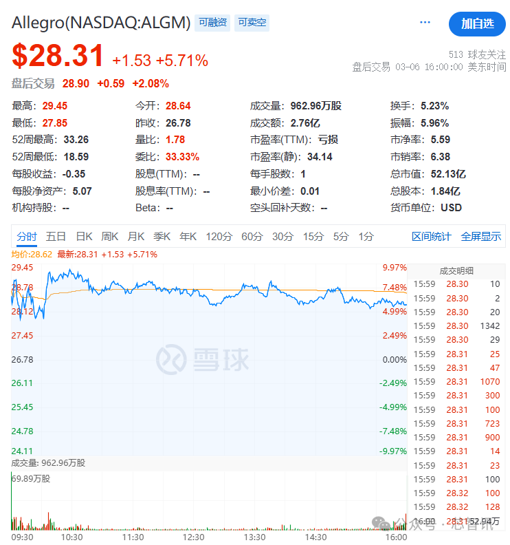 安森美的报价相比Allegro在今年2月底的收盘价高出了约57%。在该消息公布之后,Allegro公司股价在美股3月6日上涨5.71%,市值达到了52.13亿美元。而安森美在公布这一消息之前,其自身市值约为96亿美元,消息公布后的3月6日股价下跌5.61%,市值跌至不到185亿美元。
