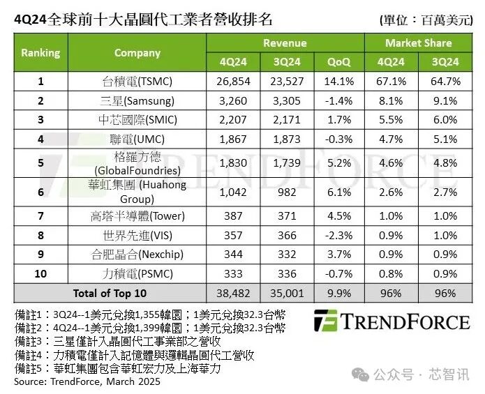 从具体的厂商表现来看,台积电受益于智能手机、HPC新品所带动的需求,2024年四季度营收环比增长14.1%至268.5亿美元,市占率环比增加了2.4个百分点至67.1%,稳居全球第一。