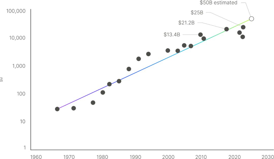 △随着时间的推移,前沿半导体制造设施的成本呈稳步上升趋势