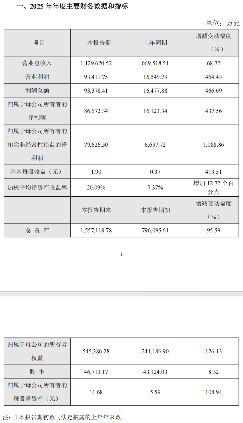 (2)营业利润、利润总额、归属于母公司所有者的净利润和归属于母公司所有者的扣除非经常性损益的净利润分别同比增加464.43%、466.69%、437.56%和 1,088.86%,主要得益于 2025 年第三季度开始受AI 需求拉动,全球存储市场迎来高度景气行情,行业整体供不应求,价格大幅上涨。