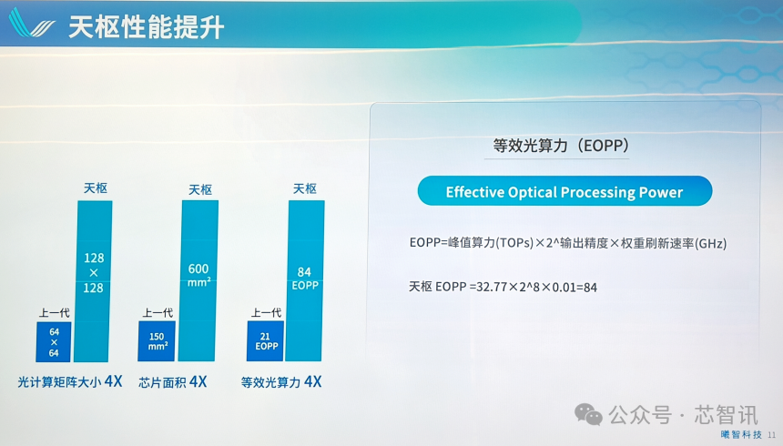 基于该评价标准,曦智科技最新的128×128光子矩阵的光芯片的等效光算力可达84EEOP,达到其上一代光芯片的4倍。