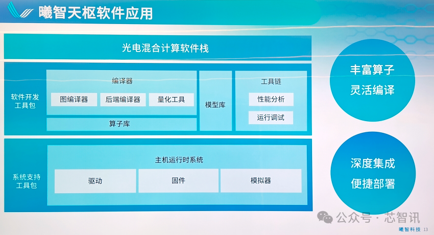 曦智科技的软件栈与主流框架如Pytorch和ONNX深度集成,客户可以通过软件栈直接使用天枢的光矩阵和电矩阵加速单元对模型和算法进行加速和验证,也可以将模型通过曦智编译框架编译部署在端侧进行推理。通过软件栈,天枢成功运行了深度卷积神经网络模型ResNet50及AI大语言模型LlaMA 2,首次实现了光电混合计算在商业化场景中的应用。另据曦智科技向芯智讯透露,目前对于DeepSeek大模型的适配也正在进行当中。