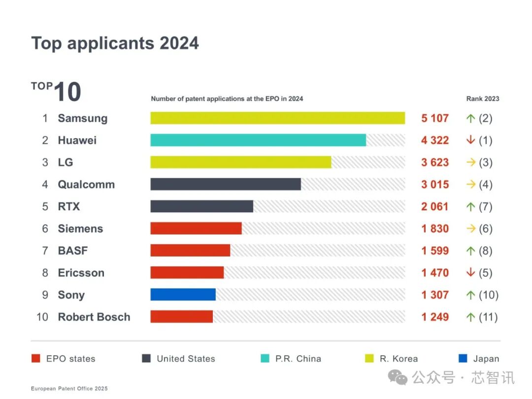 近日,欧洲专利局(EPO)公布了 2024 年专利申请数据和排名。报告显示,2024年来自世界各地的公司和发明人向欧洲专利局提交了 199,264 项专利申请,同比微幅下滑了0.1%。其中,中国的专利申请量排名全球第四,来自中国的华为的专利申请量位居全球第二,仅次于三星。