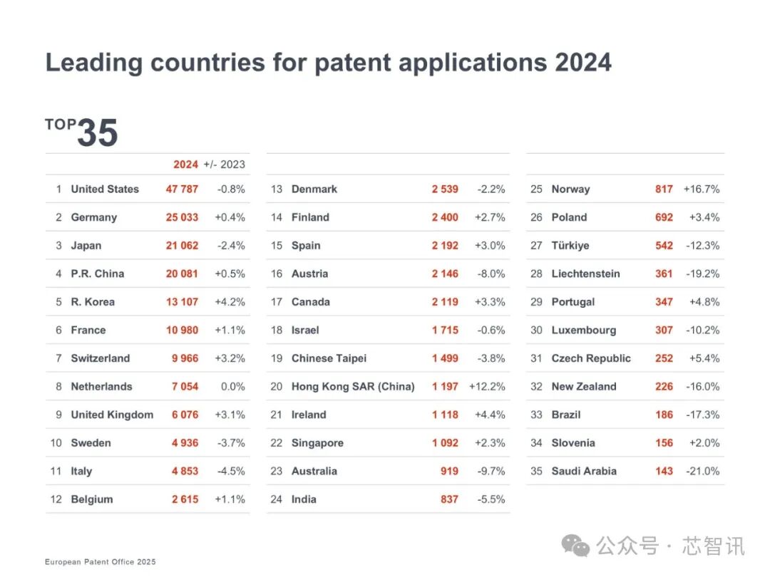 总的来看,2024年来自欧洲(包括所有 39 个 EPO 成员国)的专利申请量同比增长了0.3%,而来自欧洲以外的专利申请量则同比下滑了0.4%。